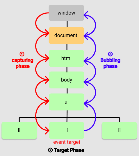 다시 id가 banana인 `<li>` 태그를 클릭한 상황으로 돌아가보자. ul 요소에 이벤트 핸들러를 바인딩한 상황이다. li 요소를 클릭하면 클릭 이벤트 객체가 생성될 것이고 클릭된 li 요소가 이벤트 타깃이 된다. 이때 이벤트 객체는 캡처링에 의해 window에서 시작해서 이벤트 타깃 방향으로 전파된다. 캡처링에 이어서 이벤트 객체는 이벤트 타깃에 도달할 것이고, 이후 이벤트 객체는 버블링에 의해 window 방향으로 되돌아간다.