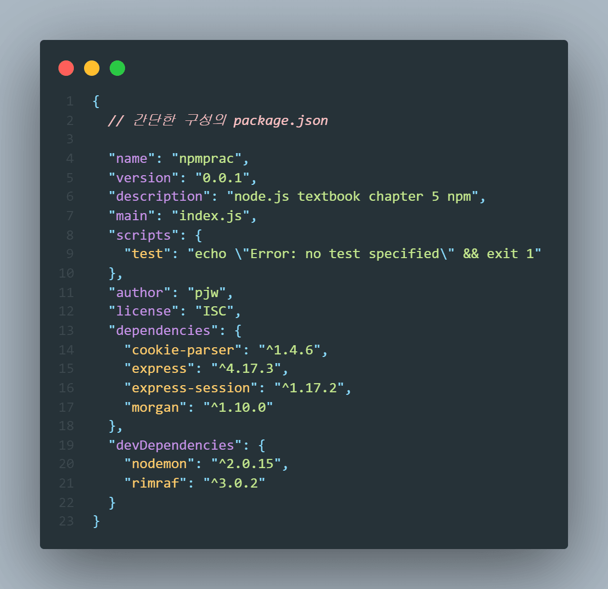 - package.json : 노드 프로젝트에 설치된 패키지의 버전을 관리하는 파일이다. 노드 프로젝트를 시작할 때 반드시 작성되어야 하는 파일이다.