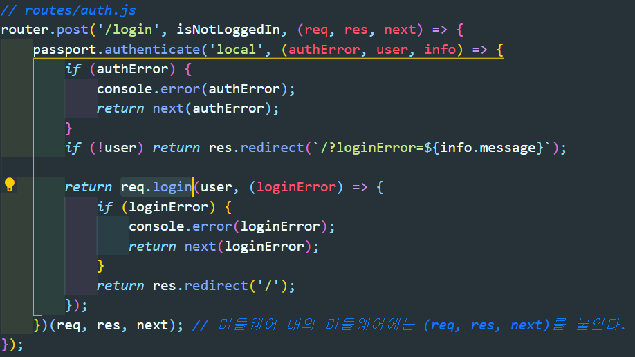 Passport는 req 객체에 `req.isAuthenticated()`라는 메서드를 부여한다. 로그인 중이면 `req.isAuthenticated()`의 값이 true이고, 로그아웃 중이면 false다. 따라서 이 메서드로 로그인 여부를 파악할 수 있다.